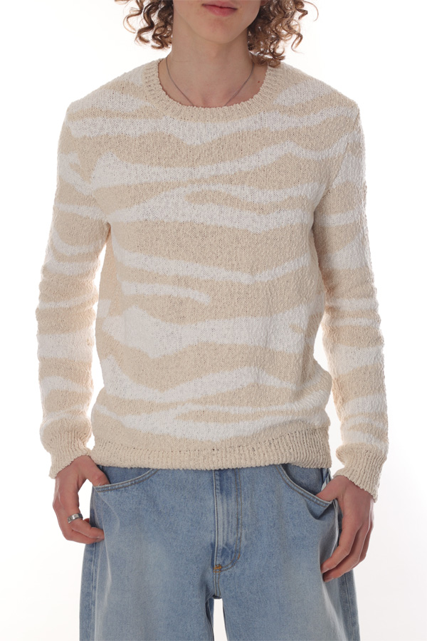 A.P.C.’s Alastor sweater is knitted in a zebra intarsia motif using cotton slub yarn. Available in tonal cream and contrasting navy blue.