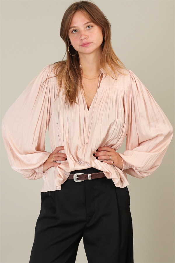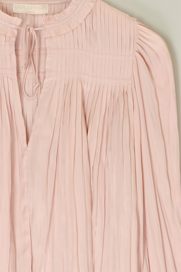 A romantic style for all occasions, the Leah top from Ulla Johnson is made from the signature plissé satin and features long voluminous sleeves and elegant gathers at the yoke.